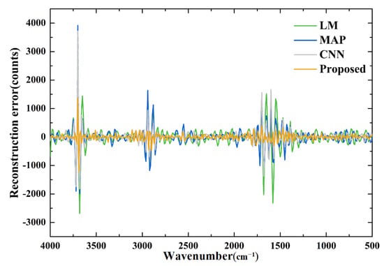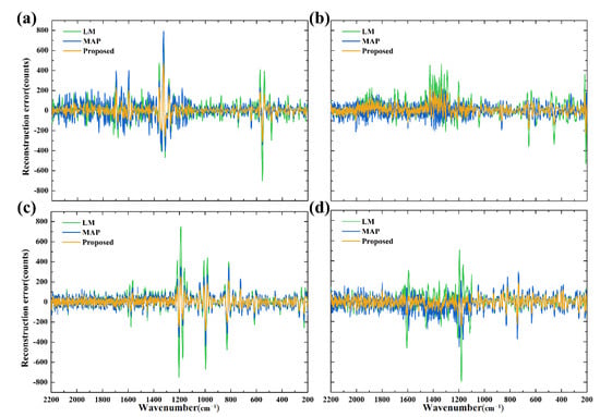 Figure 3a–d show that these methods have a certain correction effect on the measured Raman spectrum. Compared with the measured spectrum, the estimated spectra of all the four methods are more similar with the real spectrum. The effect of the two traditional methods is similar, a CNN method is slightly weaker, while the proposed method is undoubtedly the best of the four methods. The main reason for this phenomenon is due to the proposed method is a deconvolution model based on the MAP method, which is equivalent to reconstructing the estimated spectrum of the MAP method towards the real spectrum again. To further analyze the reconstruction effect of the four methods on the Raman spectrum, the real Raman spectrum is subtracted from their reconstructed spectra, respectively, and the reconstruction errors are obtained, as shown in Figure 4.