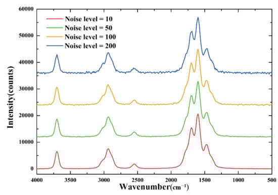 The measured Raman spectrum is always accompanied by noise. Although noise has been added to the simulated spectrum in Section 4.2, the influence of the intensity of noise on the proposed reconstruction method is not considered. After generating the measured Raman spectrum without noise, add the noise of levels 10, 50, 100 and 200 in turn to obtain four measured Raman spectra with the same degree of spectral degradation but different noise levels. Next, the four methods were employed to obtain estimated spectra. The four simulated Raman spectrum are shown in Figure 5, and the estimated spectra of the measured spectrum (noise level = 200) obtained by the four methods are shown in Figure 6, the reconstruction errors of the four methods are shown in Figure 7.