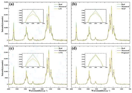 Reconstruction results of the Raman spectrum by several methods. (a) the LM method; (b) the MAP method; (c) the CNN method; (d) the proposed method.