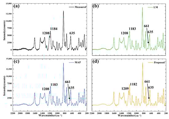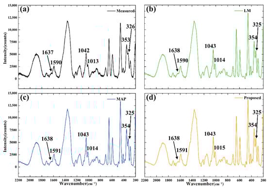 (a) Methamphetamine (C10H15N) measured spectrum and reconstructed spectra with spectral range from 2200 to 200 cm−1 by (b) the LM method; (c) the MAP method; (d) the proposed method.