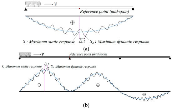 Time-history curves of static and dynamic response due to vehicles. (a) Response of a simply supported girder bridge; (b) Response of a continuous girder bridge. ∆t is the hysteresis time between dynamic and static response.