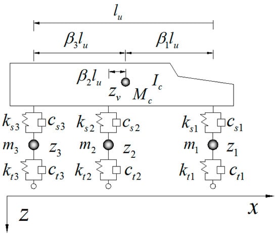 Taking a three-axle vehicle as an example, ignoring the local vibrations inside the vehicle, the vehicle body was assumed to be rigidly coupled and supported on a suspension-spring system and wheels. Both the wheels and the suspension system were considered elastomers whose damping was proportional to speed. Ultimately, the vehicle was simplified to a spring-mass model with five independent DOFs, as shown in Figure 5. The corresponding parameters of the vehicle are shown in Table 1 [,]. The vibration equation for this vehicle model was expressed as follows: