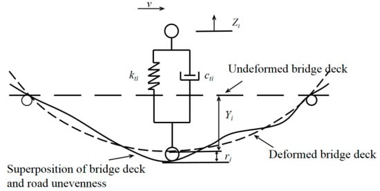 If the vehicle and the bridge were considered as two separate systems, the coupling between the two was linked by the interaction between the tire and the bridge deck, as shown in Figure 6. The interaction force between the tire and the bridge was described as: