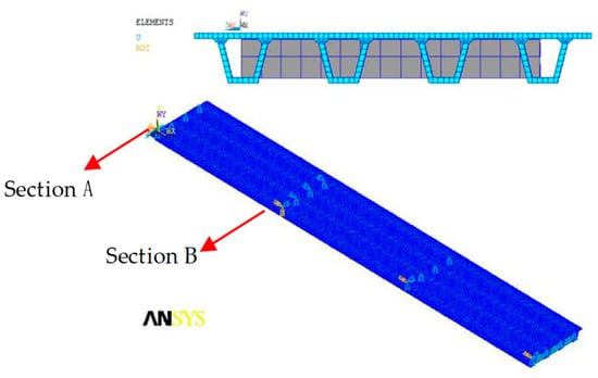 Taking precast concrete continuous box-girder bridges as examples, the cross-section is shown in Figure 8; The FEM was established by ANSYS software. Beam188 elements simulated the girder, the damping ratio was 0.05, and the model is shown in Figure 9, with the following basic assumptions: