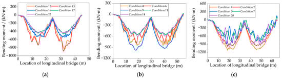 The sensitive parameters on the DLA of bridges were considered, such as bridge span length, driving speed, road surface condition, and vehicle weight, to solve the dynamic response of the negative bending moment of the continuous girder bridge. Considering many full-scale test conditions, an orthogonal test design was used to select representative conditions for the calculation (Figure 10). The condition parameters of the orthogonal test are shown in Table 2. The negative moment responses (or time-history curves) of typical conditions for two-span continuous gird bridges and three-span continuous gird bridges are shown in Figure 11 and Figure 12.