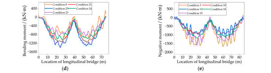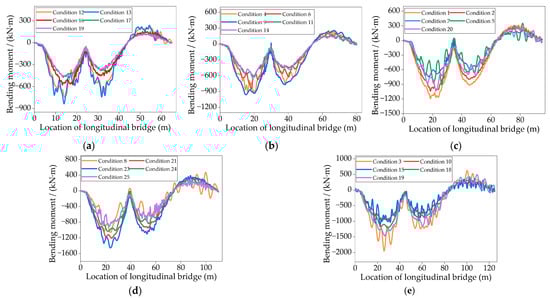 Time-history curves of the negative bending moment in the three-span continuous girder bridges. (a) Time-history curves of the bridges with a span of 20 m; (b) Time-history curves of the bridges with a span of 25 m; (c) Time-history curves of the bridges with a span of 30 m; (d) Time-history curves of the bridges with a span of 35 m; (e) Time-history curves of the bridges with a span of 40 m.