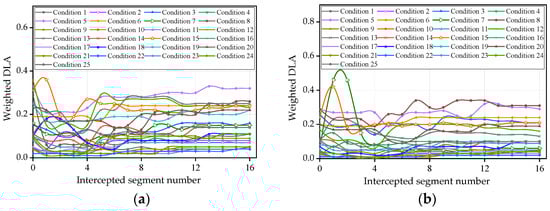 Each time-history curve was intercepted sequentially according to segment length in Table 3, and the weighted DLAs corresponding to different intercepted segments were obtained from Equation (4), as shown in Figure 14.