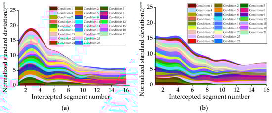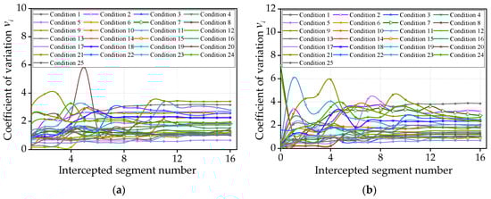 - The coefficients of variation for different segments were obtained by substituting the weighted standard deviations into Equation (21), and the results are shown in Figure 16.where is the variance of the weighted DLA for the ith intercepted segment, which is simply referred to as weighted variance; is the standard deviation of the weighted DLA for the ith intercepted segment, which is denoted to as weighted standard deviation; is the coefficient of variation of the weighted DLA for the ith intercepted segment.