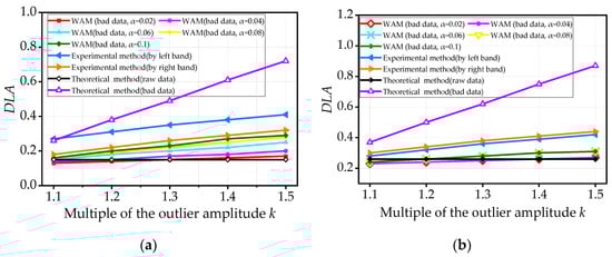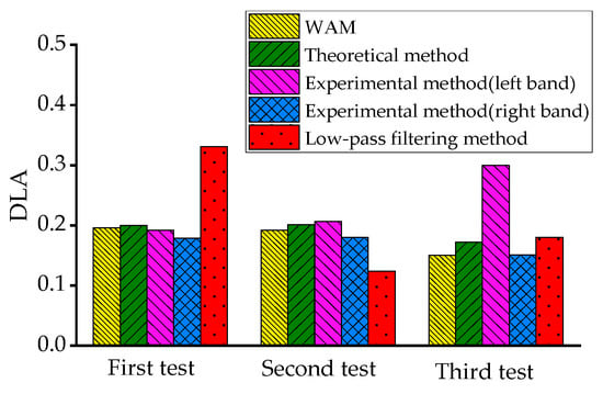 In Figure 24, the average error in the three measurements between the weighted DLAs and the theoretical DLAs is 6.5%, and the maximum error is 12.9%. The errors between the experimental and theoretical methods in DLAs range from 4.2% to 73.9%, with a large dispersion due to a left or right band selection. The errors between the low-pass filtering and the theoretical method in DLAs range from 4.5% to 65.2%. Nonetheless, the error of the DLA calculated by WAM is smaller than that of the experimental and filtering methods.