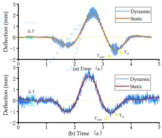 This definition can give fairly reliable results because it was obtained from the calibration test that the maximum static load response is close in magnitude to the corresponding mean response. In the field test, the maximum dynamic response can be obtained from the time-history curve of the vehicle-bridge coupled vibration. In contrast, the maximum static response can be extracted using the Taylor series or filters []. Still, in filtering, it is essential to ensure that the filtered waveform cannot be time-shifted. The reasonable cut-off frequency is also critical. However, there is still no standard available for filtering; the low range passing filter of 0.6 to 2.0 Hz is recommended [,,].