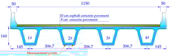 A 3 × 30 m precast box-girder bridge on the Anlan Highway (Shaanxi Province, China) was carried out as a case of DLA measurement to verify the applicability of the WAM. The cross-section of the bridge is shown in Figure 20. Strain gauges were pasted at the bottom plate of the girder in the negative moment zone of the fulcrum section. One unilateral wheel of a 36-ton vehicle slowly crossed the bridge along the white boundary of the travel lane to obtain the maximum static strain. Then, a vehicle excitation was carried out, and the lateral driving position was strictly controlled in the same way as the above static test. The sampling frequency was 200 Hz, and the measurement details are shown in Figure 21. The dynamic tests were carried out three times for representativeness.