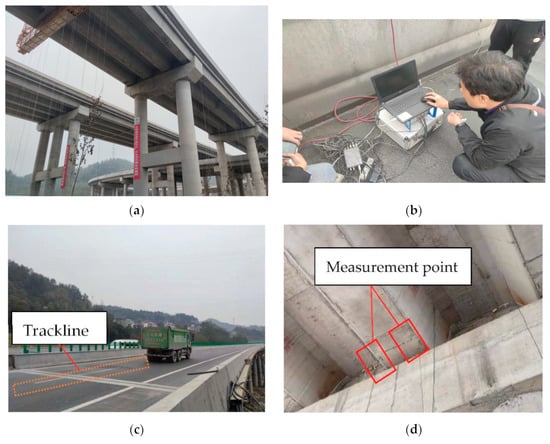 Representative photographs of the static and dynamic load tests. (a) Bridge appearance; (b) Data acquisition process; (c) Static and dynamic load tests; (d) Strain sensor arrangement.