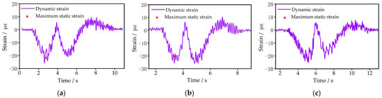 Measured dynamic strain of the bridge. (a) Response of the negative bending moment strain for the first measurement; (b) Response of the negative bending moment strain for the second measurement; (c) Response of the negative bending moment strain for the third measurement.