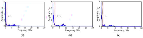 The measurement data were checked according to Section 5.2. After determining that there were no outliers, DLAs were calculated using the theoretical, the WAM, the experimental, and the low-pass filtering methods. The results are shown in Figure 22. Among them, the spectrum was obtained by FFT (fast Fourier transform) of dynamic strain for filtering (Figure 23). Then, the right side of the first main lobe in the power spectrum was regarded as the cut-off frequency, and the quasi-static strains were obtained by filtering at 1, 1.6, and 1 Hz in three measurements, respectively [].