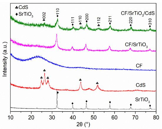 The phase structure of the catalyst can be analyzed through X-ray crystal diffraction. The XRD energy spectra of the samples such as CF/SrTiO3/CdS, CF/SrTiO3, CF, SrTiO3, and CdS are each exhibited in Figure 1. The characteristic diffraction peaks of the pure SrTiO3 sample were mainly distributed at 32.4°, 39.9°, 46.5°, 57.8°, 67.8°, and 77.1°, which can be respectively identified as the (110), (111), (200), (211), (220), and (310) crystal faces (PDF#35-0734) [26,27]. Compared with the characteristic diffraction peak energy spectrum of the pure SrTiO3 sample, the shapes and positions of distinctive characteristic diffraction peaks in the XRD energy spectra of the CF/SrTiO3 and CF/SrTiO3/CdS samples were similar to those of the pure SrTiO3, indicating that SrTiO3 was coated smoothly on these carbon fibers. The XRD energy spectrum of CF formed by carbonization of bamboo pulp fibers showed only one broad carbon diffraction peak, indicating that the carbon fibers have an amorphous structure [28,29], and therefore the corresponding carbon diffraction peaks in the XRD energy spectra of CF/SrTiO3 and CF/SrTiO3 materials were not obvious. The pure CdS sample had obvious diffraction peaks at 24.8°, 26.4°, 28.1°, 43.9°, 47.9°, and 52.0°, respectively belonging to (100), (002), (101), (110), (103), and (112) crystal faces in accordance with PDF#41-1049. It could be observed from the XRD energy spectrum of the CF/SrTiO3/CdS sample that there were not only characteristic diffraction peaks attributed to SrTiO3, but also obvious diffraction peaks at 26.4°, 43.9°, and 52.1°, which could be attributed to CdS characteristic diffraction peaks (PDF#41-1049) [30]. This indicated that the SrTiO3 and CdS semiconductor materials were successfully loaded onto the surface of CF.