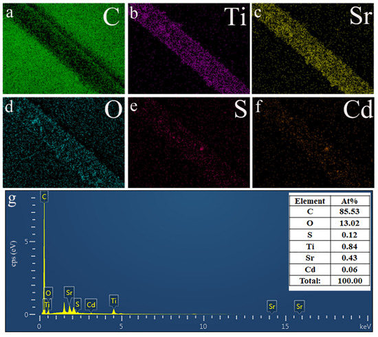 The element distribution of CF/SrTiO3/CdS was studied by SEM mapping, as shown in Figure 3. SEM mapping was mainly used to study the element distribution over the surface of the CF/SrTiO3/CdS photocatalytic composite fibers, but carbon fibers were located in the center of the CF/SrTiO3/CdS core–shell structure. Therefore, as shown in Figure 3, relatively little carbon element was detected in the CF/SrTiO3/CdS fiber [31]. It can also be seen in Figure 3 that Ti, Sr, O, Cd, and S elements were uniformly distributed on the surface of the carbon fibers. Combined with Figure 1 and Figure 2, it can be determined that the preparation of CF/SrTiO3/CdS was successful, and SrTiO3 and CdS were evenly distributed on the carbon fibers.