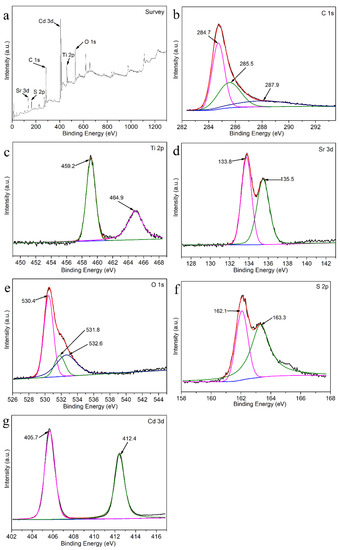 Qualitative analysis and element valence analysis of surface elements of the CF/SrTiO3/CdS can be conducted by light ray photoelectron spectroscopy. A survey spectrum of the CF/SrTiO3/CdS and high resolution XPS spectra of C 1s, Sr 3d, Ti 2p, Cd 3d, S 2p, and O 1s are shown in Figure 4. Figure 4a shows an XPS full spectrum of the samples, confirming that there were mainly six elements (i.e., Sr, Ti, Cd, S, O, and C) on the surface of the CF/SrTiO3/CdS. Although the content of carbon element was high, the signal of the carbon element shown in the figure was moderate, which was mainly because the carbon fibers were located in the center of the CF/SrTiO3/CdS core–shell structure, while the signal of the Cd element was the strongest because the CdS nanospheres were coated on the CF/SrTiO3 photocatalytic fibers. As seen in Figure 4b, it could be presumed from the spectrum of C 1s that the three fitting peaks at the binding energies of 284.7 eV, 285.6 eV, and 288.1 eV were, respectively, corresponding to C–C bonds, C–O bonds, and C=O bonds [33]. Combined with the XRD energy spectra (Figure 1), it was analyzed and presumed that the carbon fibers mainly have an amorphous structure that was similar to the structure of graphite. As seen in Figure 4c, Ti 2P had two peaks, namely, the Ti 2p3/2 peak at the binding energy of 459.2 eV and the Ti 2p1/2 peak at the binding energy of 464.9 eV (the difference between the Ti 2p3/2 peak and the Ti 2p1/2 peak was 5.7 eV), both corresponding to Ti–O bonds, and the Ti ion valence was +4 [34]. As shown in Figure 4d, Sr 3d also had two peaks, namely, the Sr 3d5/2 peak at the binding energy of 133.8 eV and the Sr 3d3/2 peak at the binding energy of 135.5 eV, both corresponding to Sr–O bonds, and the Sr ion valence was +2 [35]. It can be seen in Figure 4e that the spectrum of O 1s was fitted into three peaks, and it could be known after analysis that the peak at 530.4 eV corresponded to lattice oxygen in the photocatalyst, while the peak at 531.8 eV could be ascribed to the surface adsorption oxygen, and the peak at 532.6 eV corresponded to adsorption oxygen in oxygen vacancies [36]. The results indicated that there were oxygen vacancies in the CF/SrTiO3/CdS, which was speculated to be due to the occurrence of oxygen defects in CF/SrTiO3 during the carbonization process of bamboo pulp fiber coated with SrTiO3 at high temperature [37]. In Figure 4f, S 2p had two peaks, namely, the S 2p3/2 peak at the binding energy of 162.1 eV and the S 2p1/2 peak at the binding energy of 163.3 eV, and the difference between the two peaks was 1.2 eV [38]. Figure 4g shows a high resolution XPS spectrum of Cd 3d. The two fitting peaks at the binding energies of 405.7 eV and 412.4 eV corresponded to Cd 3d5/2 and Cd 3d3/2 of Cd2+, respectively, the difference value between these two peaks was 6.7 eV, and both peaks were corresponding to Cd–S bonds [39].