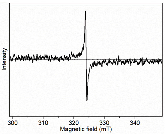 In order to deeply confirm the existence of oxygen vacancies of SrTiO3 material, EPR testing was performed for CF/SrTiO3 (Figure 5). There was a strong single peak at g ≈ 2.002, explaining that oxygen vacancies existed in the CF/SrTiO3 catalyst material, which may be caused by the SrTiO3 material being loaded and oxygen vacancies being formed in the high temperature carbonization process of the bamboo pulp fibers [40,41]. The existence of the oxygen vacancies was beneficial to the absorption of visible light by the photocatalyst and the improvement of the charge transfer ability of the CF/SrTiO3/CdS material.