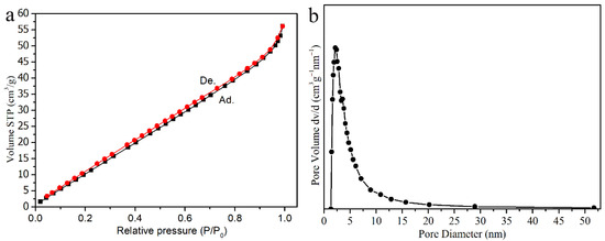 The specific surface area and internal pore size of CF/SrTiO3/CdS composite material were measured by the BET nitrogen adsorption volume method [42]. As shown in Figure 6a, it could be obtained by a BET calculation model that the specific surface area of the CF/SrTiO3/CdS photocatalytic fiber was 75.34 cm2/g, and it was calculated from a Barrett–Joyner–Halenda (BJH) equation that the average pore size of CF/SrTiO3/CdS was about 2.148 nm, as shown in Figure 6b. The loading of the CdS nanospheres on the surface of the CF/SrTiO3/CdS composite fiber was beneficial to improving the photocatalytic performance.