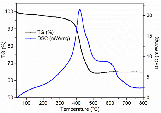 CF/SrTiO3/CdS is a fibrous catalyst with double-layer core–shell structure, and the central part of CF/SrTiO3/CdS is carbon fiber, which is not semiconductor material and cannot be split into water to produce hydrogen under the action of light. As shown in Figure 7, the approximate content of SrTiO3 and CdS in the CF/SrTiO3/CdS composite material could be determined by the TG–DSC test [43]. It could be observed that a slow weight loss (about 5%) occurred between 40 °C and 360 °C, and this phenomenon may have been caused by the evaporation of water and the oxidation of CdS. Rapid decomposition occurred, and an obvious endothermic peak appeared between 360 °C and 510 °C, and the weight loss rate was as high as about 31%, which was presumed to be mainly caused by the oxidation and combustion of carbon fibers in air conditions. According to the above analysis, we can presume that the content of SrTiO3 and CdS in CF/SrTiO3/CdS was about 64%.