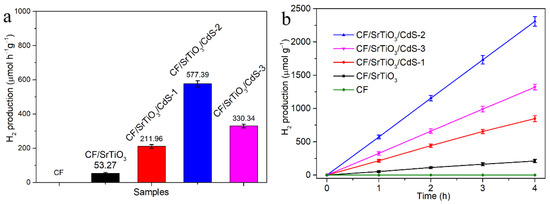 To study the effect of CdS loading on the photocatalytic performance of CF/SrTiO3, the photocatalytic hydrogen production performances of CF, CF/SrTiO3, CF/SrTiO3/CdS-1, CF/SrTiO3/CdS-2, and CF/SrTiO3/CdS-3 samples were tested, respectively (Figure 8). In the photocatalytic hydrogen production experiment, a 300 W xenon lamp was used for simulating solar light, and Na2S and Na2SO3 were taken as corresponding sacrificial agents. The related data from Figure 8 indicated that carbon fibers alone had no hydrogen production evolution performance, while the photocatalytic hydrogen evolution of the CF/SrTiO3 sample loaded with SrTiO3 was about 53.27 μmol/g·h, which was close to that of pure SrTiO3 (51.84 μmol/g·h) [44]. This was attributed to the fact that carbon fibers acted as a co-catalyst, and the synergistic effect of the oxygen vacancies and the carbon fibers promoted the separation and migration of the photoelectron–hole pairs, thus significantly improving the photocatalytic activity of the SrTiO3 material. With the loading of CdS on the surface of CF/SrTiO3, the photocatalytic hydrogen production was further improved. The hydrogen production rates of the CF/SrTiO3/CdS-1 and CF/SrTiO3/CdS-3 samples were, respectively, 211.96 μmol/g·h and 330.34 μmol/g·h, which were, respectively, about 4 times and 6.3 times that of the CF/SrTiO3 sample. However, the hydrogen production rate of the CF/SrTiO3/CdS-2 sample was as high as 577.39 μmol/g·h, which was about 11 times that of the CF/SrTiO3 sample. This was mainly due to the much more efficient carrier utilization of compound photocatalyst caused by the increasing amount of CdS. Herein, the depressed performance of photocatalytic hydrogen generation was observed as the content of CdS was further increased from CF/SrTiO3/CdS-3. This phenomenon was consistent with those found in the literature, where the photocatalytic efficiency of type-II nanoheterostructures declined as the constituent content exceeded the optimal value [45,46]. CdS is an excellent photocatalytic material for visible light, but under the condition of photoexcitation, the photogenerated carriers are easy to recombine, resulting in low quantum efficiency [47]. It was considered that with the increasing of CdS content, electron–hole recombination suppressed the cross-interface transfer of photogenerated electrons, which was the main cause of the depressed photocatalytic hydrogen generation. The reference [32] showed that the photocatalytic hydrogen production performance of pure CdS was 55.84 μmol/g∙h, which was close to that of SrTiO3 (51.84 μmol/g·h), while the photocatalytic activity was significantly improved after the carbon fibers, SrTiO3, and CdS were compounded. The above test results showed that the carbon fibers and the oxygen vacancies improved the photocatalytic activity of the CF/SrTiO3 sample, and the coating of CdS on the surface in the later stage significantly enhanced photocatalytic hydrogen evolution of the sample.