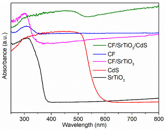 The absorption response of catalyst to light was a key factor affecting the photocatalytic performance. The light absorption performances about CF/SrTiO3, CF/SrTiO3/CdS, CF, SrTiO3, and CdS were tested by using a Hitachi F-7000 spectrophotometer. As seen in Figure 10, it could be known from the analysis that the characteristic absorption edge of SrTiO3 was around 375 nm [49], which belongs to ultraviolet light absorption, while the characteristic absorption edge of CdS was around 565 nm, which had a good absorption capacity in the range of visible light. With the introduction of CdS, the light absorption capacity of the composite photocatalytic fiber was improved, which was beneficial to improving the photocatalytic hydrogen production performance.