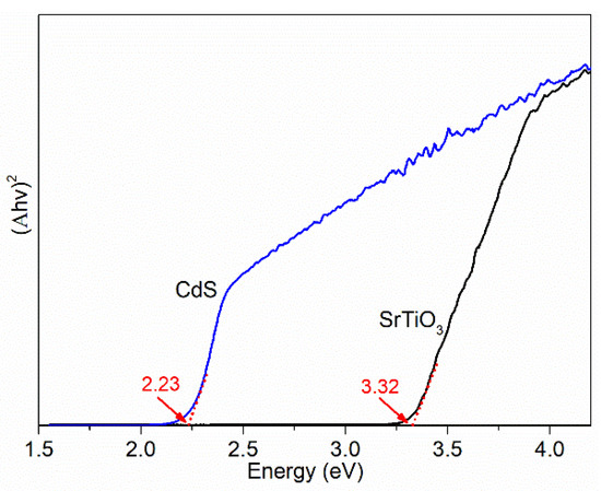 Based on Kubelka–Munk theory [50], as shown in Figure 11, it can be obtained that the band gap of CdS alone was about 2.23 eV, and the band gap of pure SrTiO3 was about 3.32 eV.