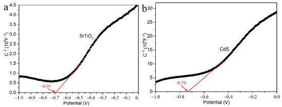 Based on the Mott–Schottky equation [51], the tangent slopes of the Mott–Schottky spectral lines of SrTiO3 and CdS were positive (Figure 12), indicating that SrTiO3 and CdS were n-type. The flatband potentials about SrTiO3 and CdS were, respectively, −0.69 eV and −0.73 eV (calomel electrode vs. SCE). The potential of aqueous SCE relative to SHE was about 0.24 eV at 25 °C [52], and thus the Fermi levels of SrTiO3 and CdS were, respectively, about –0.45 eV and −0.49 eV. It was generally believed that the conduction band position of the n-type semiconductor was 0.1 eV to the Fermi level [53], so the conduction band positions of SrTiO3 and CdS were, respectively, −0.55 eV and −0.59 eV, and the conduction band position of CdS was higher than that of SrTiO3. The band gaps of SrTiO3 and CdS were, respectively, 3.32 eV and 2.23 eV, as shown in Figure 11. We can deduce that the valence band positions of SrTiO3 and CdS were, respectively, 2.77 eV and 1.64 eV.