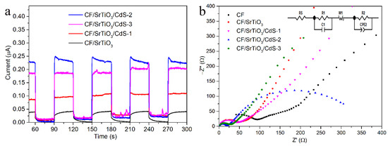 Carrier separation and migration rates were the main factors affecting the performance of the photocatalyst, and the separation and migration rates of photoelectron–hole pairs could be evaluated by testing the transient photocurrent response and the electrochemical impedance [54,55]. Figure 13 shows the transient photocurrent response spectra and impedance spectra of the photocatalytic materials such as CF/SrTiO3, CF/SrTiO3/CdS-1, CF/SrTiO3/CdS-2, and CF/SrTiO3/CdS-3. As shown in Figure 13a, in the same illumination conditions, the photocurrent of CF/SrTiO3 was about 0.04 µA, while the photocurrent of CF/SrTiO3/CdS-2 was up to 0.23 µA, which was about six times that of CF/SrTiO3. The carbon fiber had no photocurrent response, but it could transfer charges. As for CF/SrTiO3/CdS-2, the substances which had transient photocurrent responses were mainly SrTiO3 and CdS, wherein SrTiO3 mainly absorbed ultraviolet light, and CdS absorbed visible light. The loading of CdS significantly increased the transient photocurrent of the catalyst as well as the generation and separation rates of photoelectron–hole pairs, which was beneficial to improving the photocatalytic hydrogen production performance. Figure 13b shows each of the impedance spectra of CF, CF/SrTiO3, CF/SrTiO3/CdS-1, CF/SrTiO3/CdS-2, and CF/SrTiO3/CdS-3. The high frequency region was composed of an arc, and the radius of the arc reflected the intensity of the charge transfer resistance, as the smaller the radius of the arc was, the higher the migration rate of the carriers would be [56]. Therefore, the photocarrier migration rate of CF/SrTiO3/CdS was higher than that of CF/SrTiO3 and carbon fiber. The above results showed that the separation and migration rates of carriers in the CF/SrTiO3/CdS-2 material was the highest, and that is why the photocatalytic hydrogen production performance was excellent, which was consistent with the results of the photocatalytic hydrogen production experiment shown in Figure 8.