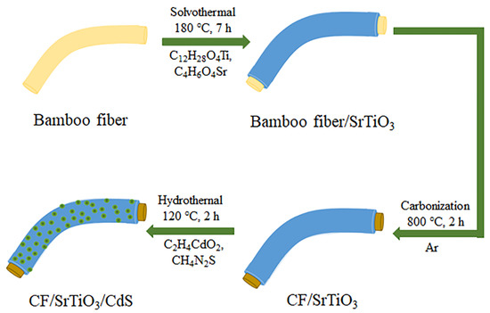 In this work, firstly, bamboo pulp fiber (Hebei Jigao Chenical Fiber Co., Ltd., Shijiazhuang, China) was used as the precursor of carbon fiber, and the SrTiO3 nanolayer was loaded onto the surface of the bamboo pulp fiber, and then carbon fiber was carbonized to prepare CF/SrTiO3 core–shell composite fiber material. Finally, the CF/SrTiO3/CdS double-layer core–shell photocatalytic composite fiber material was prepared by loading CdS on CF/SrTiO3 composite fiber [19,20]. The specific preparation process is shown in Scheme 1.