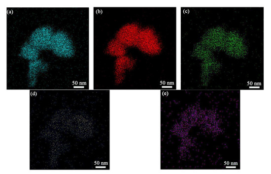 Element distribution of ZGMSO:Cr3+ (x = 0.05 sample), with (a) Zn, (b) Ga, (c) Mg, (d) Si, (e) Cr.
