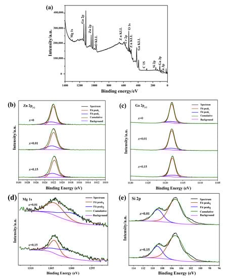 Figure 4a presents the X-ray photoelectron spectroscopy (XPS) survey spectra (Figure 4a). The results match well to the elemental mapping results, because other elements were not detected except for the original components and contaminating carbon. High-resolution XPS spectra of Zn 2p3/2, Ga 2p3/2, Mg 1s, Si 2p core levels for ZGMSO:Cr3+ (x = 0–0.15) were analyzed in Figure 4b–e, which reveals the effect of incorporation of Mg2+/Si4+ on the microstructure. Due to a few of tetrahedral Ga and octahedral Zn sites arising from anti-defects appear in spinel-structured zinc gallate [1], a small amount of anti-site Zn2+ and Ga3+ contribute to the asymmetric XPS spectra, which may be fitted using a bi-Gaussian function (Figure 4b,c). Due to the binding energy of cationic ions in the tetrahedral sites is smaller than that in the octahedral sites, the fitting binding energy at higher is assigned to the cationic ions occupying octahedral while the lower value is assigned to the cationic ions occupying tetrahedral sites [29]. Although Zn2+ ions in tetrahedron and Ga3+ in octahedron takes the dominate role, increasing the doping content of Mg2+/Si4+ (x value) induces more Zn2+ ions being in octahedron while more Ga3+ ions being in tetrahedron (Tables S1 and S2), indicating more anti-defects appear. Since most Mg2+ ions are in octahedron, the fitted area ratio of the peak at the higher energy (~1304 eV) takes the dominate role (Figure 4d and Table S3). When the x increases from 0.01 to 0.15 (Table S3), the fitted area ratio of the peak at the lower value of ~1300 eV increases and then takes the dominate role, indicating more Mg2+ ions occupying tetrahedral sites at a higher Mg2+/Si4+ doping content. However, most Si4+ ions are in tetrahedron, because the fitted area ratio of the peak at the lower value of ~105 eV is larger (Figure 4e and Table S4). Since the ionic radii of Si4+ (0.026 nm for four coordination and 0.040 nm for six coordination) is much smaller than that of Zn2+ (0.060 nm for four coordination) and that of Ga3+ (0.062 nm for six coordination) [30], Si4+ ions are indeed in both the tetrahedron (Zn sites) and octahedron (Ga sites). Increasing the x value did not significantly affect the occupation ratio of Si4+ in tetrahedral and octahedral sites. The above results suggest: (1) Si4+ ions occupy the tetrahedral sites in ZnGa2O4 in priority and their occupation exhibits an independence on the Mg2+/Si4+ doping content (x value); (2) more incorporation of Mg2+/Si4+ would induce more anti-defects appear.