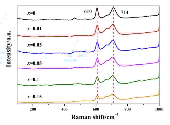 Raman spectra of ZGMSO:Cr3+ (x = 0–0.15) are exhibited in Figure 5. For the spinel structure, group theory predicts the following phonon modes, Γ = A1g + Eg + T1g + 3T2g + 2A2u + 2Eu + 5T1u + 2T2u [31]. Gorkom et al. [32] reported that the Raman peak at ~714 cm−1 is assigned to A1g Raman-active modes (k = 0), while the peak at ~610 cm−1 is assigned to T2g Raman-active modes (k = 0). In this work, the Raman peaks at ~610 and ~714 cm−1 are clearly observed for ZnGa2O4 (x = 0 sample), which indicates there are a large amount of ZnO4 groups with symmetric stretching vibrations [32,33]. However, the intensity of Raman peaks at ~610 and ~714 cm−1 weakens with increasing the x up to 0.15. More Mg2+/Si4+ doping (larger x value) would induce more Si4+ and Mg2+ ions occupying tetrahedral sites, along with more anti-defects of Ga3+ ions in tetrahedral sites, so a few of ZnO4 groups in symmetric status transformed into ZnO4 groups in distorted status, which contributes to the weakened Raman peaks.
