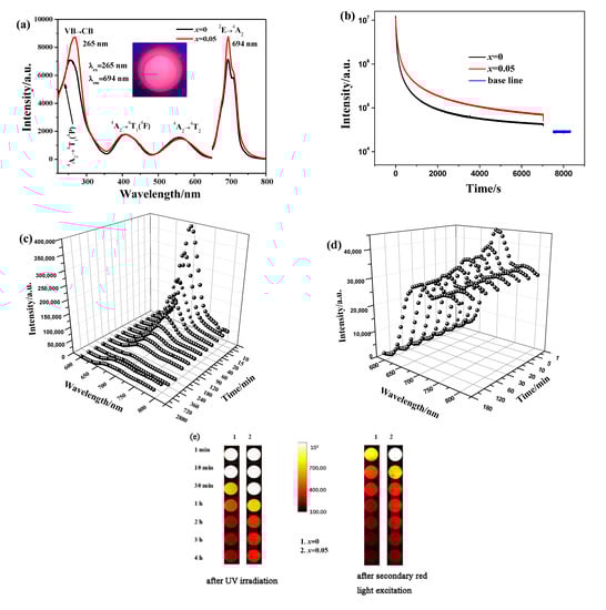 (a) PLE/PL spectra and (b) NIR persistent luminescence decay curves (monitored at 694 nm, 5-min excitation at 254-nm UV light illumination) of x = 0 and x = 0.05 samples. (c,d) are persistent luminescence spectra of x = 0.05 sample with various durations after stopping UV light and secondary excitation with a red light from a LED lamp. (e) is appearance of NIR afterglow of x = 0.05 sample with various durations obtained by a Kodak In Vivo Imaging System FX Pro at different times after removing UV irradiation for 5 min and the appearance of recharging NIR afterglow thought a secondary excitation of red light.