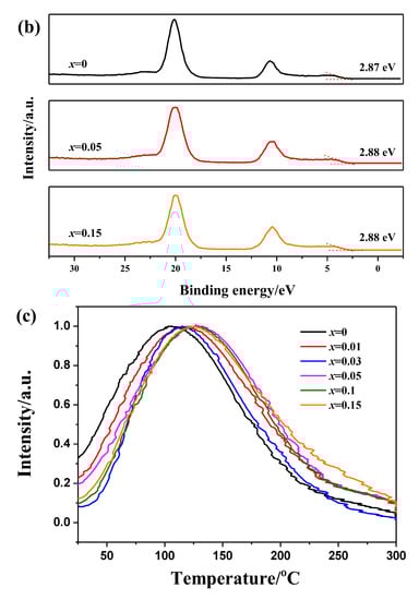 (a) Determination of bandgap energies, (b) Valence-band XPS spectra, and (c) TL glow curves of ZGMSO:Cr3+ (x = 0–0.15).