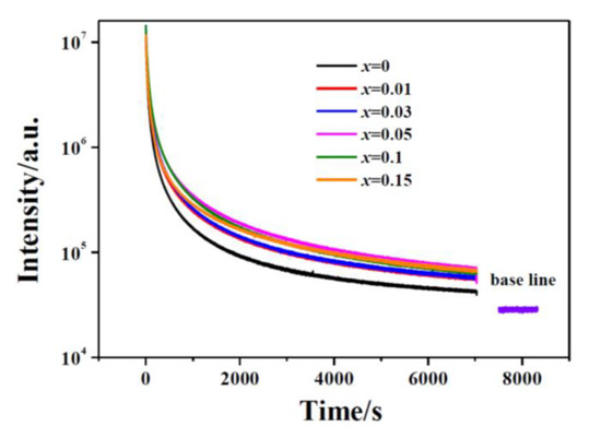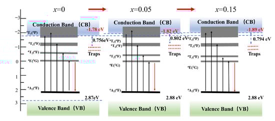 Through the combination of the above results, a schematic illustration of the energy level was constructed in Figure 8. Since the 4T1 (4P) level of Cr3+ is broad and it locates partly in the bandgap and partly in the conduction band (CB), the excitation bands arising from the VB → CB transition and the 4A2 → 4T1 (4P) transition of Cr3+ overlap, which thus contributes to the strongest excitation band at the wavelength ranging from 220 to 320 nm (Figure 6a). More Mg2+/Si4+ incorporation (larger x value) induces the up shift of CBM, so more parts of the 4T1 (4P) level appear in the bandgap that are near the CBM (Figure 8). The separation of CB and 4T1 (4P) level contributes to the red shift of the maximum peak of the strongest UV excitation band. Additionally, due to more part of 4T1 (4P) level breaks away from CB, more excited electrons leap into the 4T1 (4P) level rather than the CB, which results in more excited electrons going from 4T1 (4P) level to 2E level through nonradiative transition and thus contributing to the enhanced emission intensity at 694 nm (2E → 4A2 transition of Cr3+, Figure 6a). Since traps with deep trap depth are not easy to be emptied at room temperature, the sample having deeper traps usually exhibit more intense and longer afterglow. Therefore, x = 0.05 sample exhibits the most intense and the longest persistent luminescence, owing to its deepest defects. Since the x = 0.10 sample and x = 0.15 sample have the trap depth close to that of x = 0.05 sample, they exhibit the similar persistent luminescence to that of x = 0.05 sample (Figure 9). Previous literatures reported that anti-defects play the role as the electron traps that can capture the excited electrons, so they would contribute to the improved persistent luminescence [35,36,37]. Here, more incorporation of Mg2+/Si4+ resulted in more anti-defects, which thus contributed to the improved NIR persistent luminescence. However, Si4+ ions occupy the tetrahedral sites (Zn sites) in ZnGa2O4 in priority, which leads to the appearance of Ga vacancy with three negative charges and Si4+ in Zn sites with two positive charges. These defects contribute to the electron traps with a deeper depth more than ~1.0 eV [28,38,39], where the captured electrons cannot easily escape at room temperature and thus contributes to the worse NIR persistent luminescence. Therefore, the most intense and the longest persistent luminescence was observed for x = 0.05 sample, which are the comprehensive outcome from the anti-defects and the defects arising from Si4+ ions occupying the tetrahedral sites.