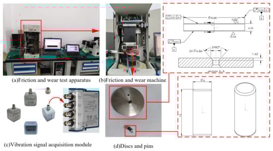 The friction and wear test device (a–c) and a schematic representation of the upper and lower samples (d).