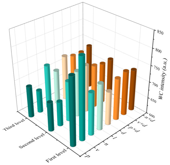 The higher the peak intensity, as shown in Figure 3, the larger the grain size of the compound on the surface of the composite coating. If the grain size is too large, this increases the surface roughness of the composite coating, and its surface properties are degraded. A uniform and fine-grained structure is required to improve the surface properties of a composite coating. As the peak intensity fell at the same position for each element in each group of experiments, these peaks were subjected to range analysis.