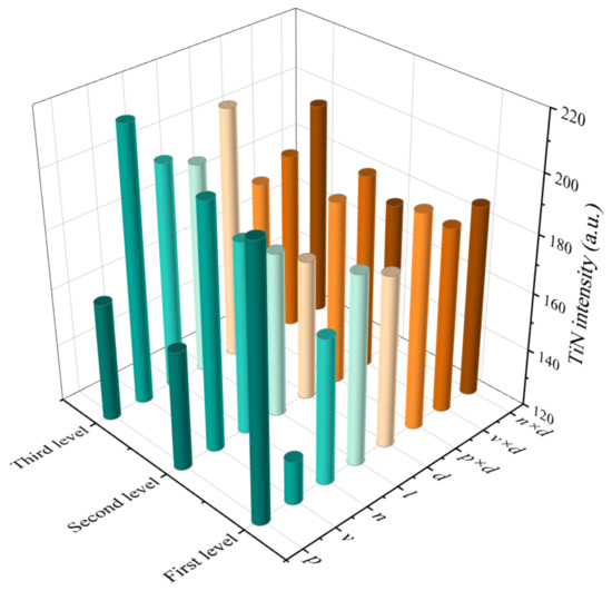 It can be seen from the results of the TiN range analysis in Figure 6 that the factors that had the most significant impact on the TiN grain size were the scanning speed, v, and the laser power p. Compared with the WC grains, the size of the TiN grains changed less. When the laser scanning speed, v, increased, the time for the laser to act on the surface was reduced, making the WC grain size smaller so that some of the TiN grains took the place of the WC grains, increasing the size of TiN grains by the time the cooling finished. As the laser power increased, the N element on the surface of the coating was volatilized by the heat. This also affected the TiN grain size. So, an increase in laser power led to an increase in the WC content. Some of the TiN grains were also covered, further weakening the TiN peak.