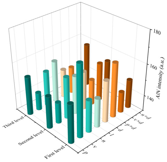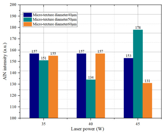 From the results of the AlN range analysis shown in Figure 7, it can be seen that the factors that had the greatest influence upon the AlN grain size were the scanning speed, v, and the interaction between the laser power and the micro-texture diameter p × d. This is because the diffusion rate of the Ti element on the surface of the composite coating was higher than that of Al element, so a place-exchange phenomenon occurred. Some Al elements were oxidized to form more uniform and dense tiny grains on the surface of the coating. This resulted in a reduction in the AlN grain size. As the laser power increased, the temperature in the molten pool increased, and the degree of mutual diffusion between each of the elements increased, resulting in a refinement of the final AlN grains. Some of the AlN grains were covered by other larger grains. It can be seen from Figure 8 that an increase in the micro-texture diameter and an increase in the laser power were together beneficial for the refinement of AlN grains on the surface of the composite coating.
