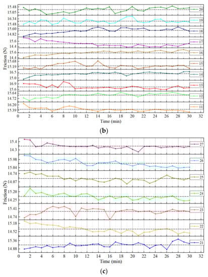 Frictional force values over the period 0–30 min. (a) is friction data for 1–10 sets of tests, (b) is friction data for 11–20 sets of tests, (c) is friction data for 21–27 sets of tests.