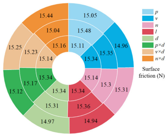 In Figure 10, the innermost ring shows the lowest surface friction value for each parameter at the first level. The outermost ring shows the lowest surface friction value for each parameter at the third level. The factors that had the most significant influence on the surface friction were the laser power, p, the micro-texture spacing, l, and the interaction between the number of laser scans and the micro-texture diameter, n × d. This implies that these three factors are the most important ones to consider when seeking to control the surface friction of a composite coating. The laser acts on the surface of the composite coating. The material in the laser-treated area heats up and melts, forming splashes that cool on the surface of the coating. When the laser power increases, the time the laser beam acts on the surface of the coating is longer, the energy operating on the surface increases and the amount melted also increases. As a result, after cooling, the number of splashes on the surface is increased, the surface roughness is increased and the temperature is also higher during the process. This softens the surface of the coating, making it easier for the surface material to fall off, further adding to the surface roughness and the average frictional force. As the laser power increases, the depth of the micro-texture increases. When the surface is subjected to friction and wear, the ability of the micro-texture to capture and store wear debris is therefore enhanced. The size of the WC grains on the surface of the composite coating is significantly reduced, and the surface roughness is reduced. The surface friction of the composite coating, therefore, shows a downward trend as the laser power is increased. During friction and wear, the Al element also oxidizes on the surface of the coating to form an Al2O3 film. This has a lubricating effect and reduces the surface roughness. The laser power has an impact on this phenomenon by affecting the Al content of the coating’s surface. The laser processing of the micro-texture produces burrs around the edges of the micro-pits, increasing the roughness in the areas where the micro-texture is present. When the micro-texture spacing is increased, the overall amount of micro-texturing on the surface decreases. There are, therefore, fewer burrs and less friction. This suggests that the micro-texture distribution should not be too dense and that an appropriate increase in the micro-texture spacing will help to reduce the surface friction.