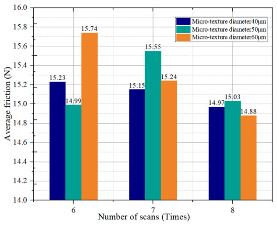 Figure 11 is a binary diagram relating to the interaction between the number of laser scans and the micro-texture diameter. It can be seen that the pattern of changes between the three groups was inconsistent. When the micro-texture diameter increased, the ability of the micro-texture to capture and store wear debris was enhanced, and the heat dissipation performance was better. The surface of the composite coating was not easily damaged, so increasing the micro-texture diameter helped to enhance its anti-wear performance. As the number of laser scans increased, the laser energy acting on the surface increased. The number of spatters on the surface of the composite coating therefore also increased. The spatters cooled rapidly and adhered to the surface of the coating, resulting in a decrease in surface roughness. As the number of laser scans increased, the depth of the micro-texture also increased. This reduced how much material could splash out of the micro-texture. This enhanced the replenishment of the micro-texture chips. The Al oxidation on the surface also increased as the temperature rose, improving the lubrication effect and reducing the grain size and surface roughness. So, micro-texturing the surface of a composite coating dramatically reduces the surface friction. The frictional force decreased as the number of laser scans increased, and the diameter of the micro-texture became smaller. An increased depth leads to a decrease in a micro-texture’s lifespan and creates an upward trend. Taking the surface hardness, element content, phase analysis and friction and wear test results together, it can be seen that the enhanced surface hardness of a composite coating and refinement of the surface grains induced by adding a micro-texture are all conducive to reducing surface friction.