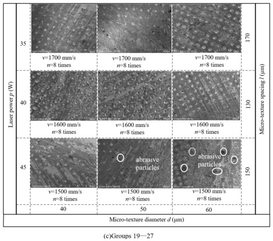 Micro-texture wear morphology. (a) is the friction and wear morphology of 1–9 groups of tests, (b) is the friction and wear morphology of 10–18 groups of tests, (c) is the friction and wear morphology of 19–27 groups of tests.