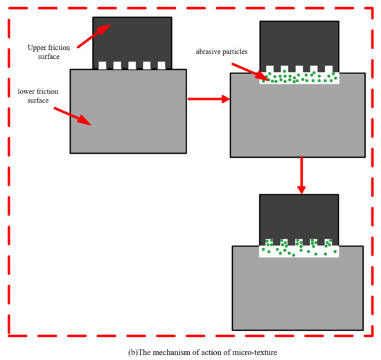 The micro-texture was placed on the surface of the composite coating. This reduced the surface roughness of the coating and limited the number of adhesive nodes created during the friction and wear process, thereby reducing the amount of adhesive wear. It can be seen from Figure 13 that the micro-texture worked by storing the abrasive particles. Although the central area was seriously worn, most of the abrasive particles remained in the micro-texture, which reduced the wear debris on the surface of the coating and, thus, the abrasive surface wear. The placement of the micro-texture also increased the capacity of the surface of the composite coating to dissipate heat and reduced the oxidative surface wear. In sum, adding a micro-texture to the surface of a composite coating effectively reduces the degree of surface wear.