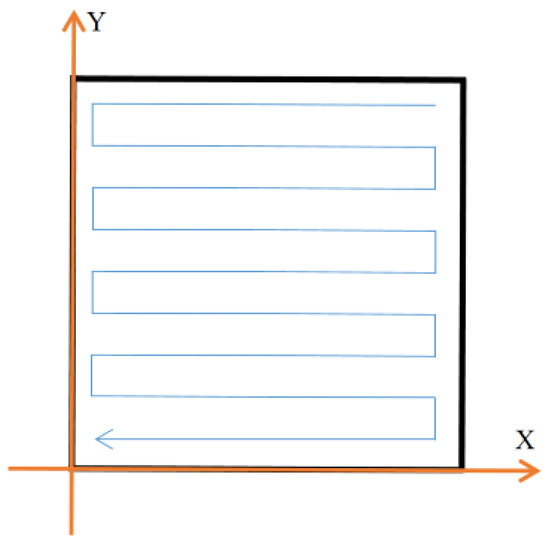 A JZ-5020–4DX ultrasonic transducer (Hangzhou Jinyuan Ultrasonic Technology Co., Ltd., Hangzhou, China) was used in the ultrasonic impact test. The amplitude is 10 μm, and the prestress is 50 N. The vibration head diameter is 3 mm, and the moving speed is 1 mm/s. The ultrasonic impact area occupies a square area of 10 mm × 10 mm, and the impact path is “S” type, as shown in Figure 3.