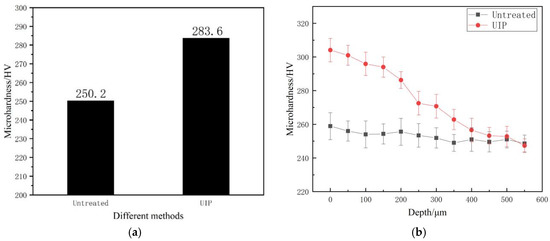 Figure 5 shows the average micro-hardness on the surface and micro-hardness in the depth direction of 316L stainless steel samples by selective laser melting under different treatment methods. It can be seen from the figure that the micro-hardness of samples in the surface and depth direction after ultrasonic impact is higher than that of samples without treatment. It can be seen from Figure 5a that the average surface micro-hardness of 316L stainless steel sample manufactured by selective laser melting after ultrasonic impact is 283.6 HV is about 13.5% higher than that of the untreated 316L stainless steel sample. As shown in Figure 5b, when the surface of the sample is subjected to ultrasonic impact treatment, the surface of the sample is hardened to a certain depth. However, the micro-hardness in the depth direction gradually decreases with the deepening of the depth, and the depth of the affected layer is about 400–500 μm. Then, the micro-hardness component in the depth direction of the sample is close to the hardness of the matrix. Ultrasonic impact has little effect on the micro-hardness at this depth. Therefore, it can be seen that ultrasonic impact can lead to plastic deformation of the material surface and effectively improve the micro-hardness of 316L stainless steel prepared by laser selective melting. At the same time, ultrasonic impact also has a certain strengthening effect on the micro-hardness of 316L stainless steel sample in the depth direction. However, with the deepening of the depth, the effect of the plastic deformation and the work hardening gradually decrease, resulting in a gradual decrease in the depth direction of the hardness.