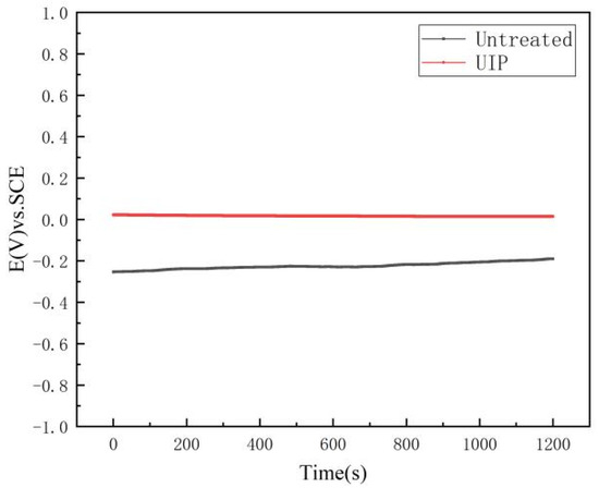 Figure 6 shows the open circuit potential of 316L stainless steel prepared by SLM in the 3.5% NaCl solution before and after the ultrasonic impact. The open-circuit potential reflects the corrosion trend of the sample in the 3.5% Nacl solution. The smaller value of the open circuit potential indicates that the material is more prone to have electrochemical corrosion behavior [24]. As can be seen from Figure 6, after 1200 s the open-circuit potential of 316L stainless steel prepared by SLM after ultrasonic impact gradually tends to be stable, and the maximum open-circuit potential value is 0.01404 V. While the open-circuit potential of 316L stainless steel prepared by SLM without treatment is smaller, floating roughly at −0.1903 V. After the ultrasonic impact, the open circuit potential of the sample is positive, and the open circuit potential of the sample is improved to a certain extent, indicating the possibility of electrochemical corrosion is reduced. The increase of the open circuit potential indicates that the corrosion resistance of the sample has been improved after ultrasonic impact strengthening. This is because the surface hardness of the material has been enhanced under the high-frequency vibration of ultrasonic impact, and the wear resistance of the material has been improved. Therefore, the corrosion resistance of the material has been improved.