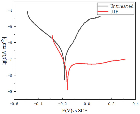 After the open circuit potential reached a certain stable value, the potentiodynamic polarization curves of the 316L samples prepared by SLM in the 3.5% NaCl solution before and after ultrasonic impact were measured, as shown in Figure 7. The curve shown in the figure is obtained after soak in the corrosive solution for 20 min. Compared with the polarization curve of the untreated sample, it is found that the polarization curve shifted to the right after ultrasonic impact strengthening, indicating that the corrosion tendency of the sample decreases. After the ultrasonic shock strengthening, the curve moves slightly downward, indicating that the current density has been decreased to a certain extent and the corrosion performance of the material has been improved. As can be seen from the polarization curve in Figure 7, the self-corrosion potential of the untreated sample is −0.1866 V. After ultrasonic impact strengthening, the self-corrosion potential of the sample is increased to −0.1606 V, moving forward by 250 mV. At the same time, the self-corrosion current density of the untreated samples also decreased from 2.47 × 10−7 to 4.87 × 10−8 A·cm−2.The higher the self-corrosion potential, the smaller the self-corrosion current density, indicating that the material is less likely to be corroded. Therefore, ultrasonic impact can improve the corrosion resistance of the sample.