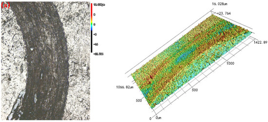The surface wear morphology of 316L stainless steel samples prepared by SLM before and after ultrasonic impact is shown in Figure 11. Under the friction condition of friction time 20 min and load 2 N, the wear condition of the ultrasonic impact samples is better than that of the untreated samples, and the degree of wear is relatively small. The wear surface of the untreated sample has grooves of wear scars, the shape of the wear marks was complete and clear, and the distribution is uniform. Compared with the untreated sample, the depth of the wear scars of the ultrasonic impact sample is relatively shallow. The distribution of the wear degree on the surface is uneven, and the wear scars are distributed on both sides without obvious cracks. According to the experimental results, the wear resistance of samples after ultrasonic impact is improved, mainly because ultrasonic impact treatment can enhance the microhardness of 316L stainless steel prepared by SLM. Then, it can reduce the friction coefficient of 316L stainless steel, so as to improve the wear resistance and prolong the service life of 316L stainless steel.
